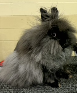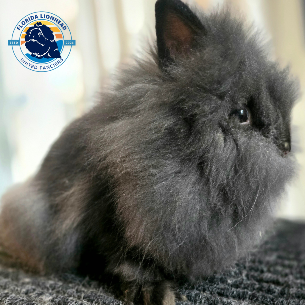 Black Lionheads have black wool and a black saddle with rollback fur. Their eyes are black and ears are black as well. They can be distinguished from the seal variety because you can see the gray cast to the wool in these images. Seal would have a brown cast, rings in the extension of the wool, and a white in the belly. Black shows all black with no brown cast.